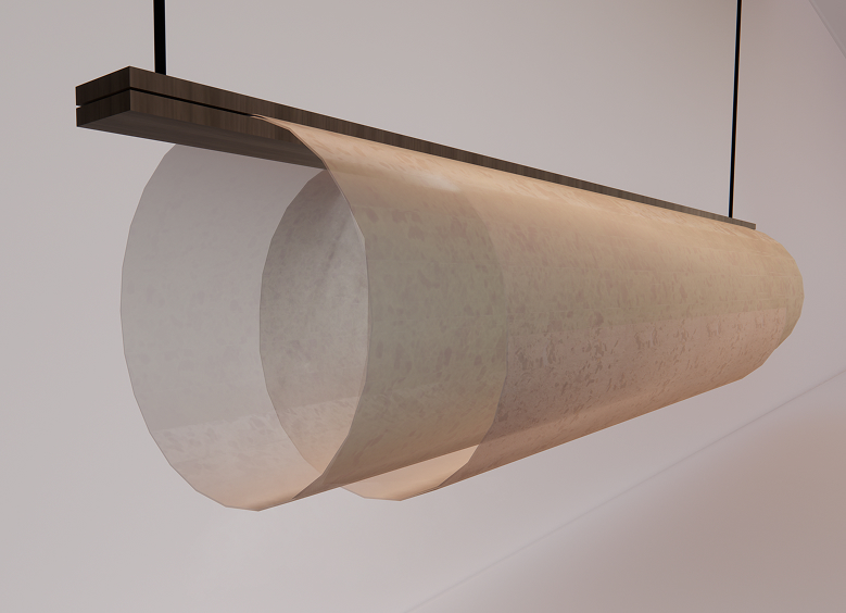 The series consists of two pendant lights and one floor lamp. Sleek, thin metal suspensions meet walnut wood, coming to life in combination with the materials we produced ourselves. It was important to us to emphasize both fragile and functional design. The translucent paper creates a warm, diffuse atmosphere, enhanced by two carefully positioned spotlight light sources that provide subtle highlights and depth. Depending on the color of the paper—whether inspired by fruit or herbal tea—the light can be adjusted to suit different moods. A deliberate design decision was also to overlap the paper layers, creating a sense of depth and richness in the overall composition.