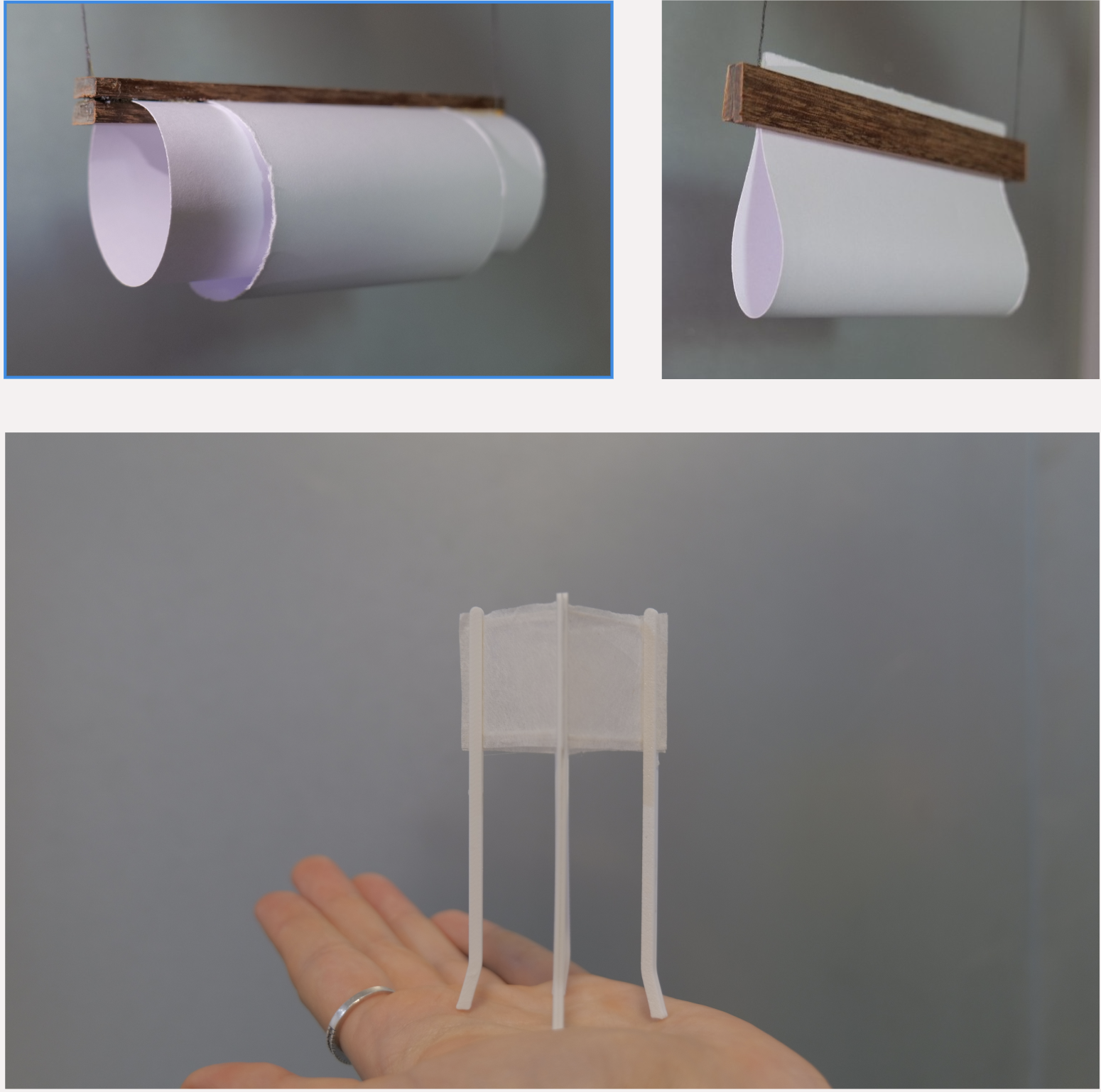 The paper is carefully clamped between two wooden slats, ensuring stability while maintaining the delicate appearance. The thin metal rods pass through this layer and are guided by the deliberately slender canopy at the top, emphasizing the lightness and elegance of the overall design. This approach allows the structure to remain minimal yet functional, while the layered construction highlights both materiality and craftsmanship.
