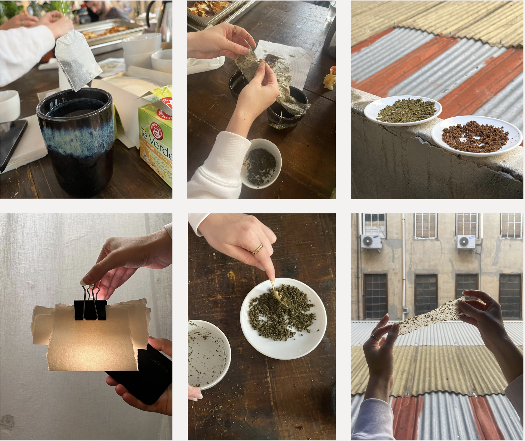 The materials are made with the traditional papermaking technique. We were focusing on how we could use and incorporate all the residues of a teabag and its packaging. By using only mild household chemicals to soften up the tissues and fibers, we are able to create a blended paper that even holds the plastic and foils found in teabags and packaging.