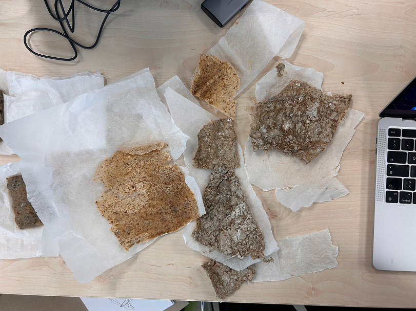 Our goal is to transform these two waste streams into a new material that can replace other packaging in the hotel. The material is made by mixing shredded cellulose from both waste types with cornstarch, vinegar, and water, resulting in a solid and usable material.