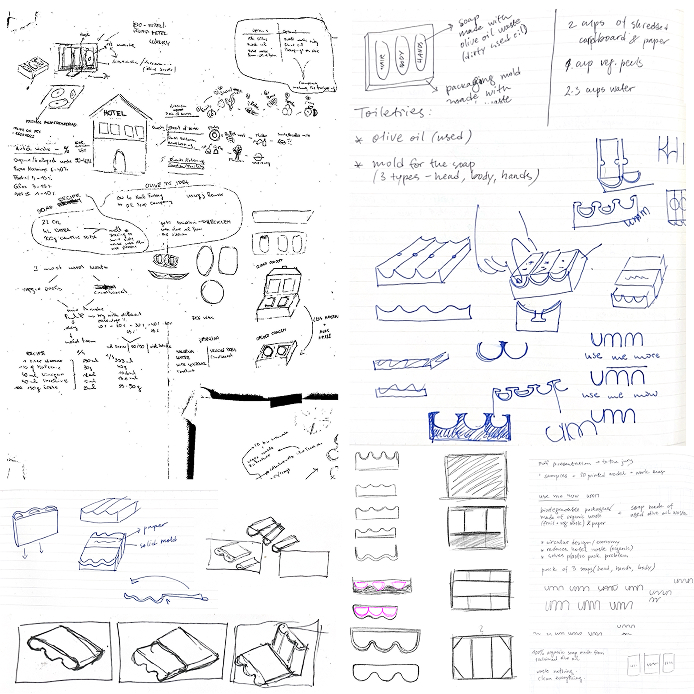 In the initial idea phase, we sketched out the problem to identify its essence. Over time, the focus narrowed to the issue of waste—specifically vegetable peels, paper, and used olive oil. The concept developed so that the oil would be transformed into soap, while the peels and paper would form the packaging material.