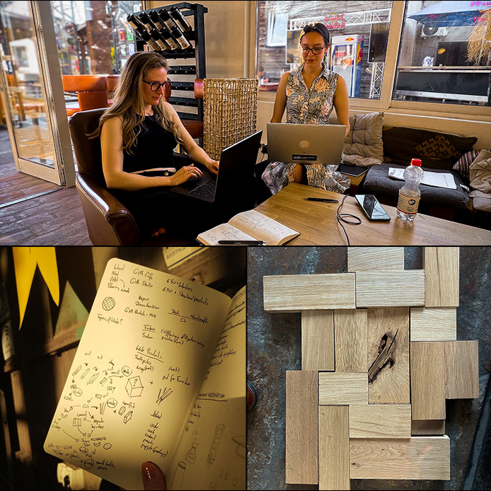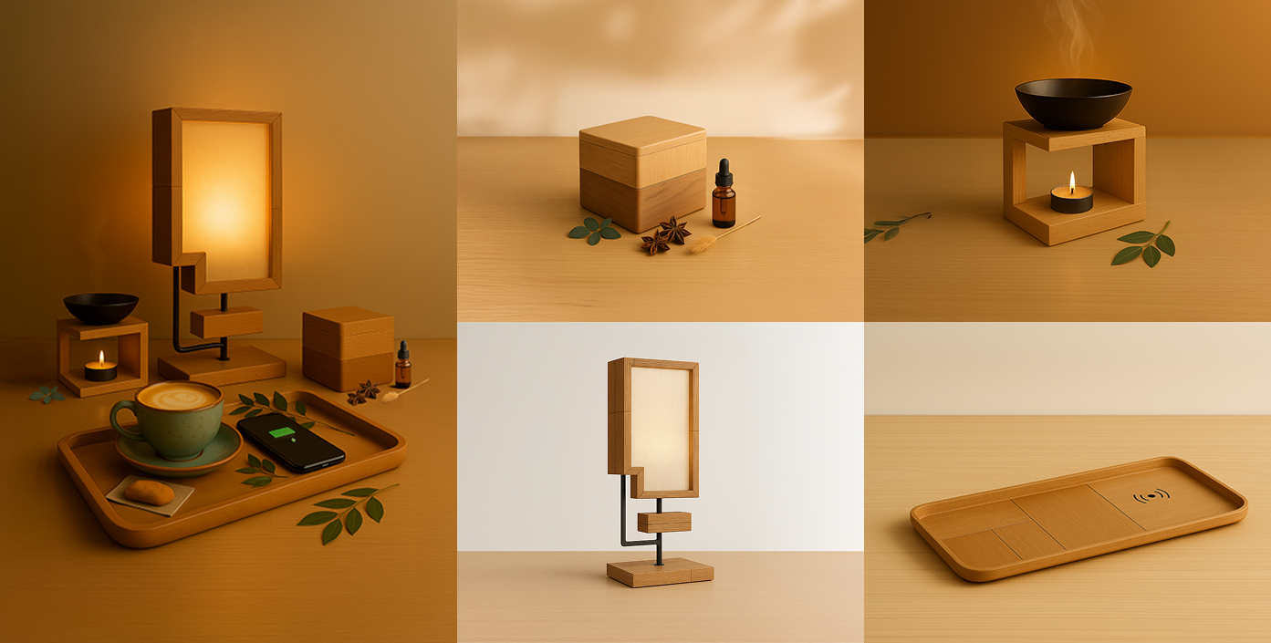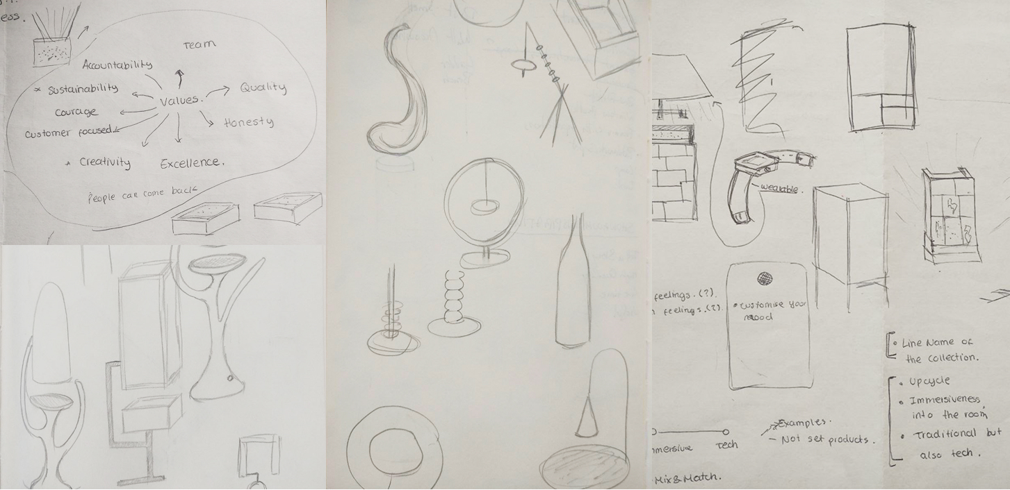 Drawing on our backgrounds in design thinking, we began the ideation session by interacting with the samples collected during the factory visit. We arranged wood offcuts in different configurations, sketched potential approaches to address the briefs, and identified various solutions with application potential. After some initial sketching, we decided to focus on the project briefs that challenged us to develop products from GIR’s waste materials and create emotionally resonant objects.
