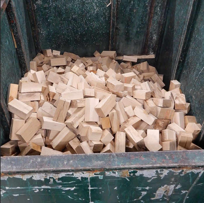 During this step, significant offcut material is produced – typically from trimming, squaring, and eliminating unusable edges. The final product represents only one-sixth of the wood used during production.